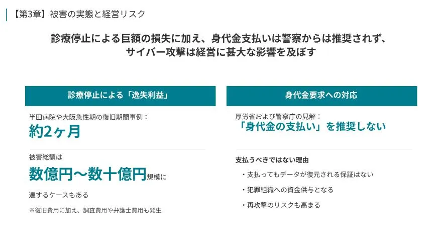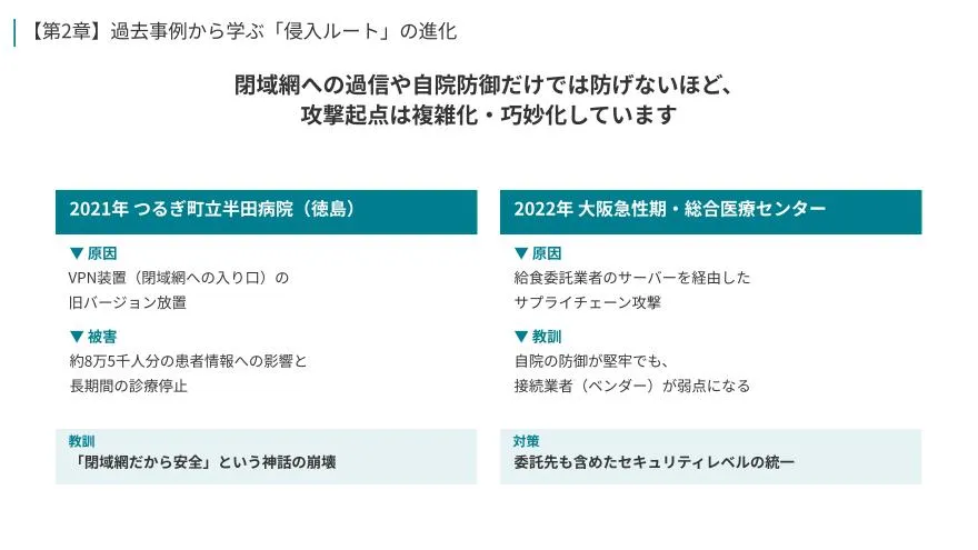 サイバー攻撃は電子カルテ“本体”よりも、保守用VPNやナースコール等の周辺機器、さらには委託業者など「管理が手薄になりやすい接点」から入り込むケースが増えています。本資料は、複数の事例を通して侵入経路の変化と被害の現実を押さえたうえで、院内ネットワークとIoT機器を守るために“今すぐ確認すべきポイント”を実務の言葉に落とし込みます。まず何を棚卸しし、どこを分離し、ベンダーと何を明確化すべきか。判断と着手の順番をつけたい方向けの緊急レポートです。