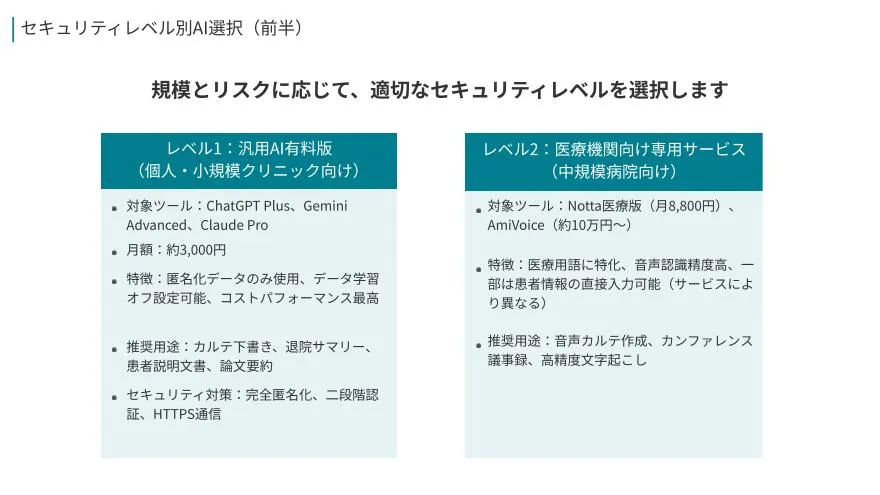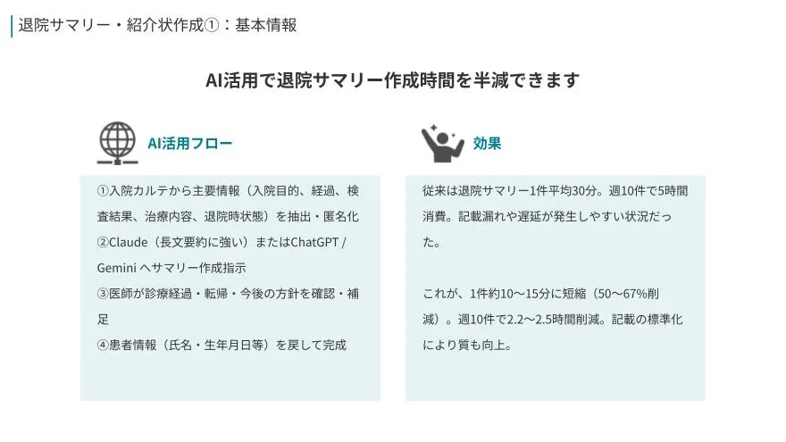 生成AIを「試して終わり」にせず、診療現場の実務に組み込むための手引きです。ツール選びやハルシネーション対策といった基礎から始まり、患者情報を扱ううえで外せないセキュリティ原則・匿名化手順・チェック体制までを一連の流れとして整理。さらに、カルテ下書きや退院サマリー、患者説明文書など“時間を取られがちな業務”を、どの順番で導入すれば安全に効果が出るかを段階的に示しています。現場で使えるルールと型を作りたい人向けの実践資料です。