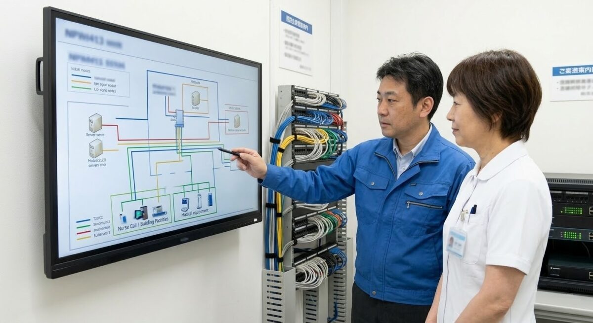 ナースコールシステムは、現在その多くがIPネットワーク化されており、サーバーやハブを通じて管理されています。しかし、これらは「医療機器」や「情報システム」とは別の「設備」として扱われることが多く、IT部門の管理外(シャドーIT化)になりやすい傾向があります。
